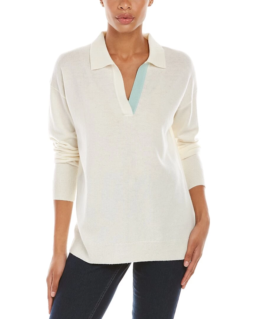 - Contrast Placket Collar Wool & Cashmere-Blend Sweater In Cream/Mint With Spread Collar, Contrast Placket And Ribbed Trim