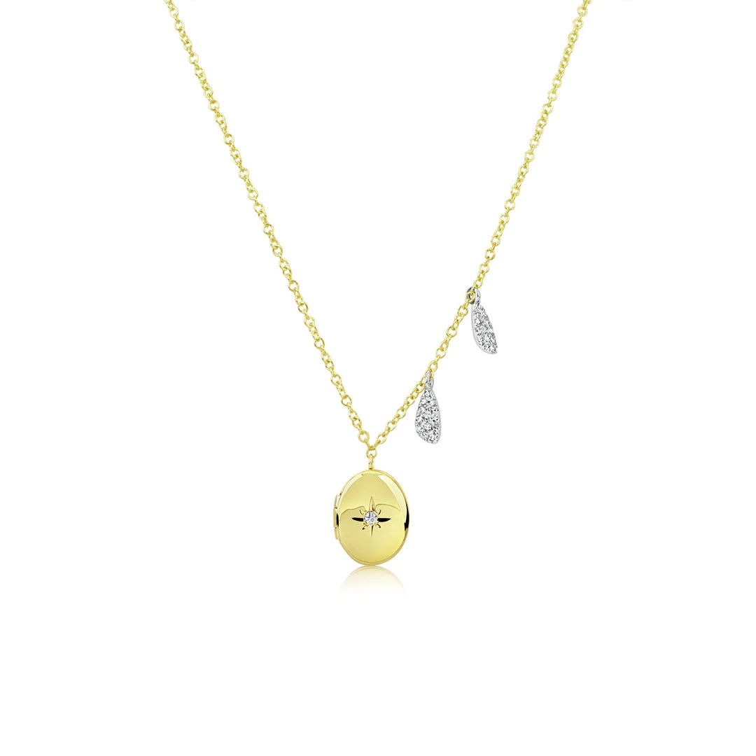 This stunning piece is crafted in 14k yellow gold ad features a circle locket center that you can put photos or meaningful things into! On the locket, there is a diamond starburst, and on the chain are two diamond encrusted charms.